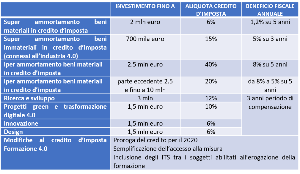 Il disegno di legge di bilancio 2020-2022 prevede risorse per 7 miliardi di euro per le misure: nuovo credito d’imposta su beni strumentali; nuovo credito d’imposta R&S, innovazione e design e proroga del credito d’imposta formazione 4.0